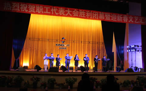 為了慶祝公司第一屆一次職工代表大會順利閉幕,活躍公司廣大職工的文化生活,讓員工提前度過一個歡樂、祥和的春節(jié),在公司黨支部和工會委員會的精心策劃下,在基層分會全體員工的的共同努力下,加班加點排練節(jié)目,為了使每個動作表演到位有效果,演出精彩上檔次,職工對節(jié)目一遍又一邊遍的進行排練、修正,并籌集了演出的服裝、道具,以最高的表演水平充分展示金維公司員工的良好精神面貌。2013年1月19日下午16時,由公司黨支部和工會委員會聯(lián)合舉辦的慶祝公司第一屆一次職工代表大會順利閉幕暨“迎新春”文藝節(jié)目匯演大型晚會,在一片歡慶祥和的新春祝語聲中拉開了帷幕,公司總經(jīng)理陳德剛、副總理高勇、副總經(jīng)理魏偉、財務(wù)總監(jiān)高廣禮、生產(chǎn)總監(jiān)王智和公司工會主席劉海玉等領(lǐng)導(dǎo)和公司全體員工觀看了文藝節(jié)目演出活動。